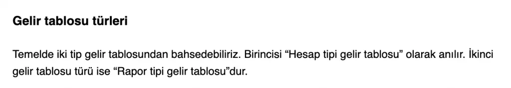 Gelir tablosu dipnotları ile birlikte: Gelir tablosu kalemlerinin daha iyi anlaşılmasını sağlayan açıklamalar sunan dipnotlar, finansal raporlara eklenerek şeffaflığı artırır. Bu farklı türler, gelir tablosunun hazırlanması sırasında işletmenin özel durumuna ve raporlama ihtiyaçlarına göre seçilmelidir.